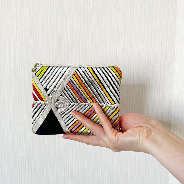 [ヴィンテージシルクの帯を素材にしたハンドサイズポーチ] バッグから取り出せばちょっと人目を惹く、唯一無二の伝統工芸。 持つだけでそんな上質さを選ぶハイセンスなあなたを演出できるポーチです。 着物が好きで小物にもこだわりたい。 一点物や人と被らない独自のファッションが好き。 環境問題が気になっているから、エシカル・アップサイクルな製品を選びたい。 こんな方に手に取って頂きたい、 眠っていた資源をアップサイクルで楽しむ循環型衣料です。 おしゃれなSDGs、そして伝統文化を感じるライフスタイルを一緒に送りませんか? ● パスポート、コインケース、お財布代わりにも良いサイズ ティッシュやマスク、お懐紙入れ、エチケットグッズもおしゃれに隠して。 使いやすく、いくつあっても何を入れてもお役立ちなマルチポーチです ● 診察券、カードケースとしても。 憂鬱な通院でも華やかな気持ちに。 受付でもさっと取り出せて失くしにくい目立つポーチはいかがですか? ● クリームや目薬、リップなどもまとめて入れて。 バッグの中も散らかりにくく、小さなケアアイテムも迷子にならずにさっと取り出せる。 ご自分を労る素敵な時間は、希少なポーチで更に贅沢に。 お化粧室でも他の誰ともかぶることはありません。 ● 旅先や美容院でのジュエリー・コスメの持ち歩きは 是非このポーチに入れて。 糸で模様を織り出している袋帯は、美しいだけでなく張りの強い厚手生地。 加えて、シルクの柔らかな内布。 2つの緩衝効果で大切な中身を守ります。 ● 夏はクリアバッグに入れれば、あなた独自のコーディネートの一つとして活躍! ちょっとだけ中身の目隠しにもなり、季節感を楽しみながらプライバシーを守れます。 ● 長辺が端から端までファスナーで開きます。 玉付タイプで滑りにくく、つまみやすい引手です。 ● ご挨拶ギフト、特に海外へのお土産に大人気! 日本の帯の美しさが話題になること間違いなし。 goodな実用性は全世界共通! ● ご家族やお友達同士で柄違い 仲良しのあの方と、おそろいで絆を感じてはいかがですか? 着物に親しんだ世代のご年配の方はもちろん、 斬新で個性的なものをお好みの若い方まで 年代問わずしっくりくる素材感です。 帯地違いでの商品もたくさんございます♡ https://shop.kinuhajp.com/categories/6083708 ●複数製作しています。 ご購入される商品の模様の出は画像2, 3枚目でご確認の上お選びください。 一本の帯生地から作る数が限られるため、数量限定の商品です。 カットの位置で模様も変化するので、実質一点物となります。 【素材】 黒地の袋帯から。銀色をベースにビビッドなマルチカラーが並ぶ斜めストライプがモダンなスタイリッシュ!なんとこちらは若い松の図案を抽象化した模様です。頂点にひそやかに配置された丸みの部分は新芽を表現し、植物の持つ生命力・常緑樹である松の力強さや瑞々しさへの願いが込められています。 正絹(シルク) ハンドメイド 内布あり サイズ 幅 17、高さ 13 (cm) ●使用例は同タイプの参考画像です。 【お取扱い】 ・お洗濯やドライクリーニングは想定していません。 ・補強を施した上で縫製しておりますが、尖ったものや重い物を多量に入れると破損する場合があります。 【その他注意事項】 ヴィンテージ着物からのリメイク品です。リサイクル生地にご理解を頂ける方のみご購入ください。 シミ/ヤケ/縫い跡などを着用に支障のない程度で使用する場合があります。また、やむを得ず継ぎを入れる場合があります。 撮影画像は出来る限り実物と近づけるように努めておりますが、ご使用の端末・モニター環境により若干の差異がある場合がございます。 製作には注意を払っておりますが、万が一商品に問題がありました際はまずはご使用前に写真を添えてご連絡下さい。 他サイトでも販売中であり、在庫を共有しています。 商品ステータスは最新であるように心がけておりますが、注文が重なってしまった場合は先着の方を優先させて頂きます。何卒ご容赦下さい。 ---------- Hand-sized pouch made from a vintage silk OBI size width 17, height 13 (cm) silk, handmade, limited Multiple items are produced. The pattern of the product you are purchasing is shown in the second and third images. This item is made from Vintage KIMONO cloth. There may be spots, discolorasions and seam marks on the part that does not interfere.
