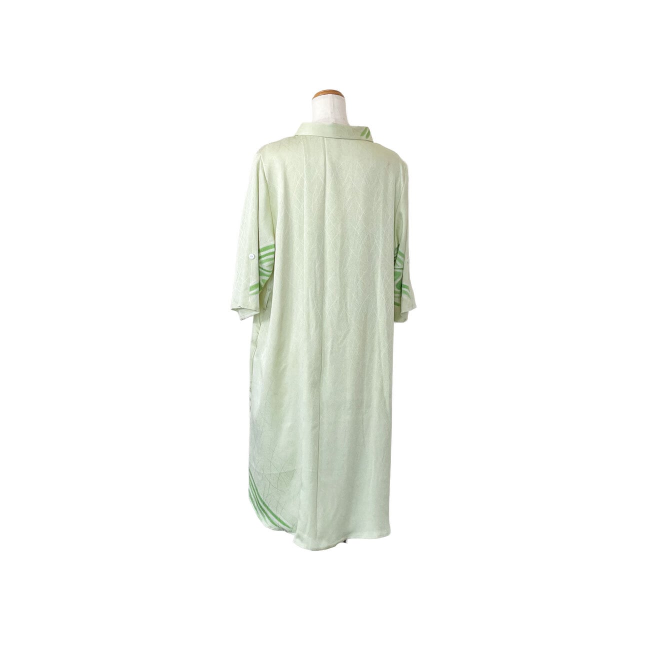 This vintage houmongi (formal kimono) is set against a soft pastel green background, where stylized wave patterns in bright green flow with refreshing simplicity. The design evokes a sense of breeze and clarity, like sunlight dancing on water. Woven in luminous rinzu satin, the fabric gleams with a bold sheen, while subtle curved motifs resembling blades of grass emerge in the weave, shifting beautifully as the light catches the surface.