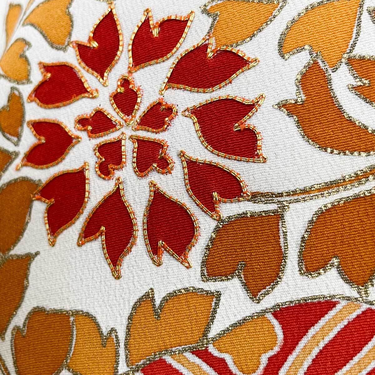 漆黒の地に、赤・黄・白の道長取りが鮮やかに映えるヴィンテージの黒留袖。菱や七宝、花を抽象的に描いた文様が金の縁取りと金駒刺繍で引き立ち、華やかさと気品を併せ持ちます。しっとりとした縮緬地が光を柔らかく受け止め、伝統の格式にモダンな力強さを添えた一枚です。