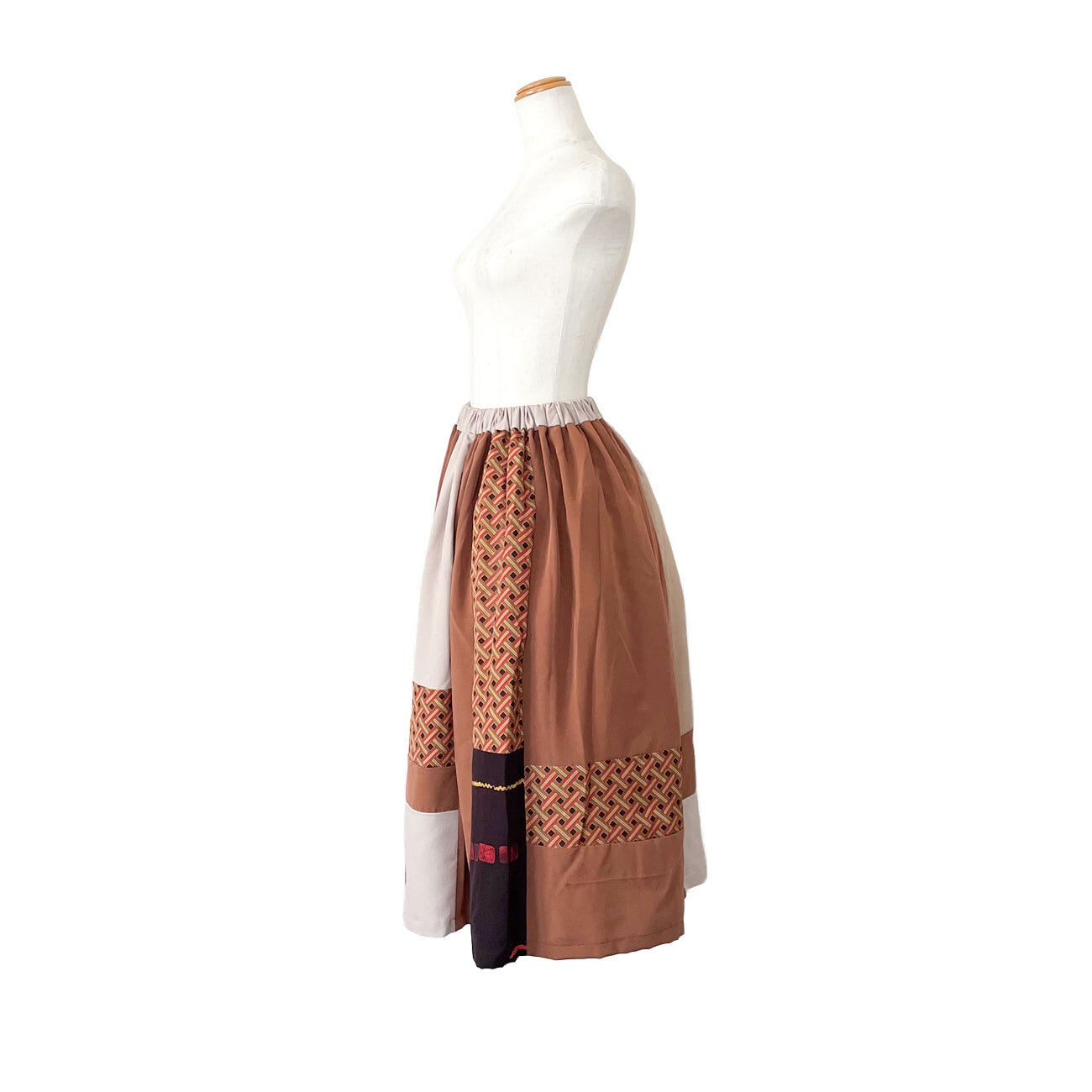 ブラウン系を中心にたくさん組み合わせました。無地、柄物、地紋のもの、、、様々な色柄ながら統一感のあるトーンで配色。細かくパッチワークするエリアもランダム感に配置し、大人に似合う遊び心スカートです。