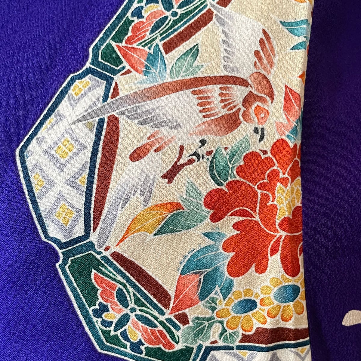青い生地は中厚の綸子で艶めく光沢を放ちます。一枚だけ、友禅で絵皿に花鳥模様が施されて。カラフルできっぱりとしたタッチの美しくもモダンなテイストです。