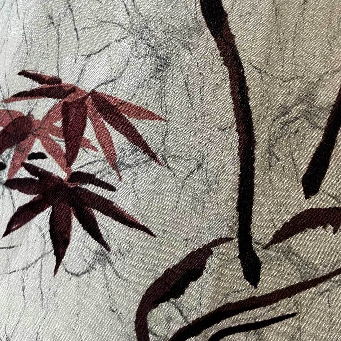 淡い抹茶色の地に、氷割れ模様が静かに揺らめくシルクの錦紗。紫がかった茶色で描かれた竹や草木は、水墨画のように流れる筆致で、自然の気配をそっと映します。ところどころに織り込まれた山並みや植物の地紋が、光を受けて控えめに浮かび上がり、見る角度によって表情を変える一枚。薄くしなやかな質感と穏やかな色調が、上品で静かな美しさを引き立てます。