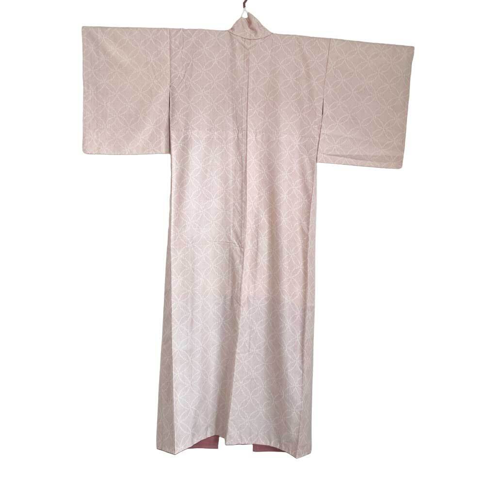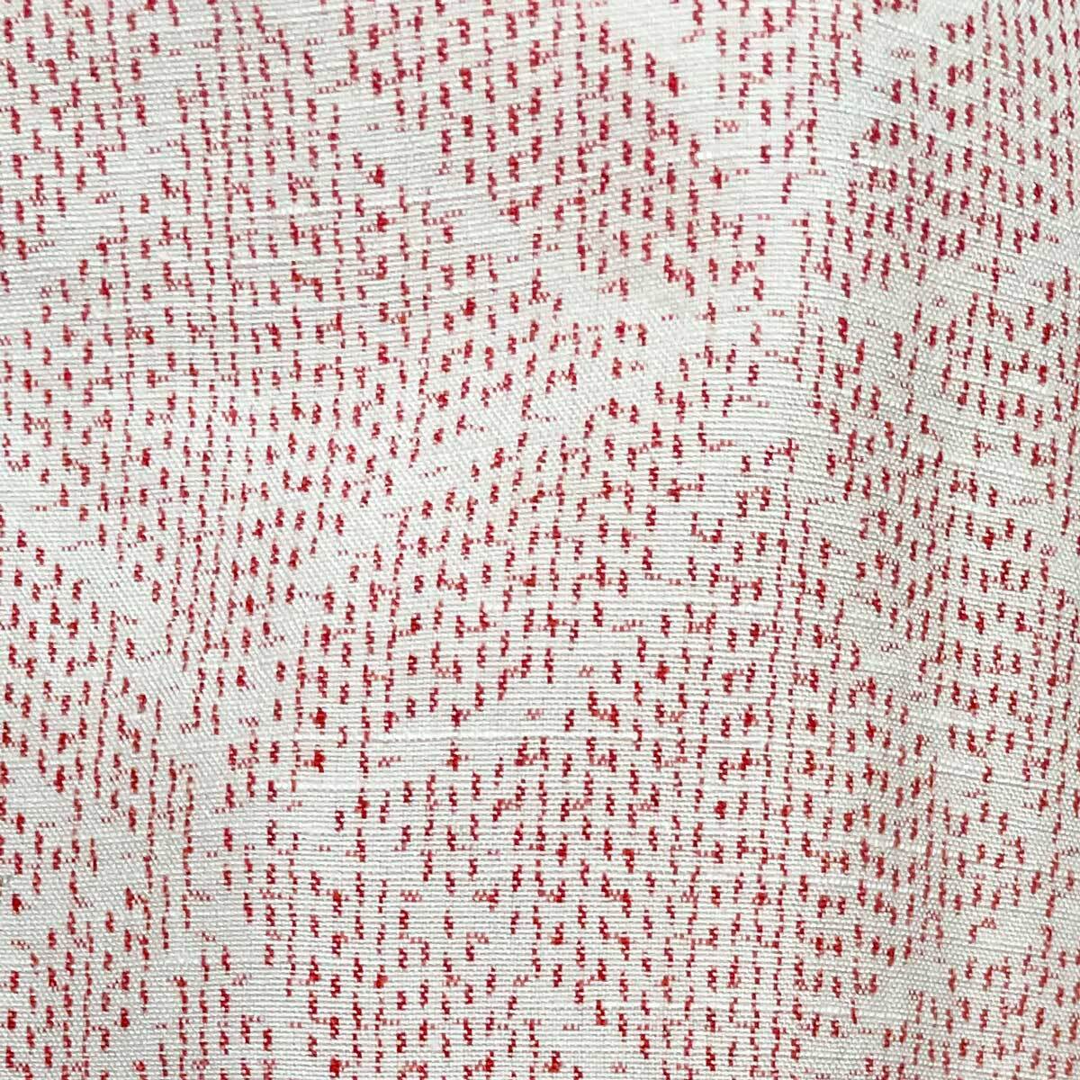 生成りの地に赤い絣がやさしく走る、手織りの紬の着物。遠目には淡いピンク色にも見え、素朴さの中にあたたかみが漂います。糸を先に染めて模様を織り出す絣ならではの、かすれたような表情が魅力。繰り返し配された七宝模様は、円と円がつながることで「縁」や「円満」を象徴し、途切れなく続く幸せを願う柄です。節のあるラフな質感の絹地は、着る人の動きに合わせて自然な陰影を生み、肩の力を抜いた上品さを演出します。
