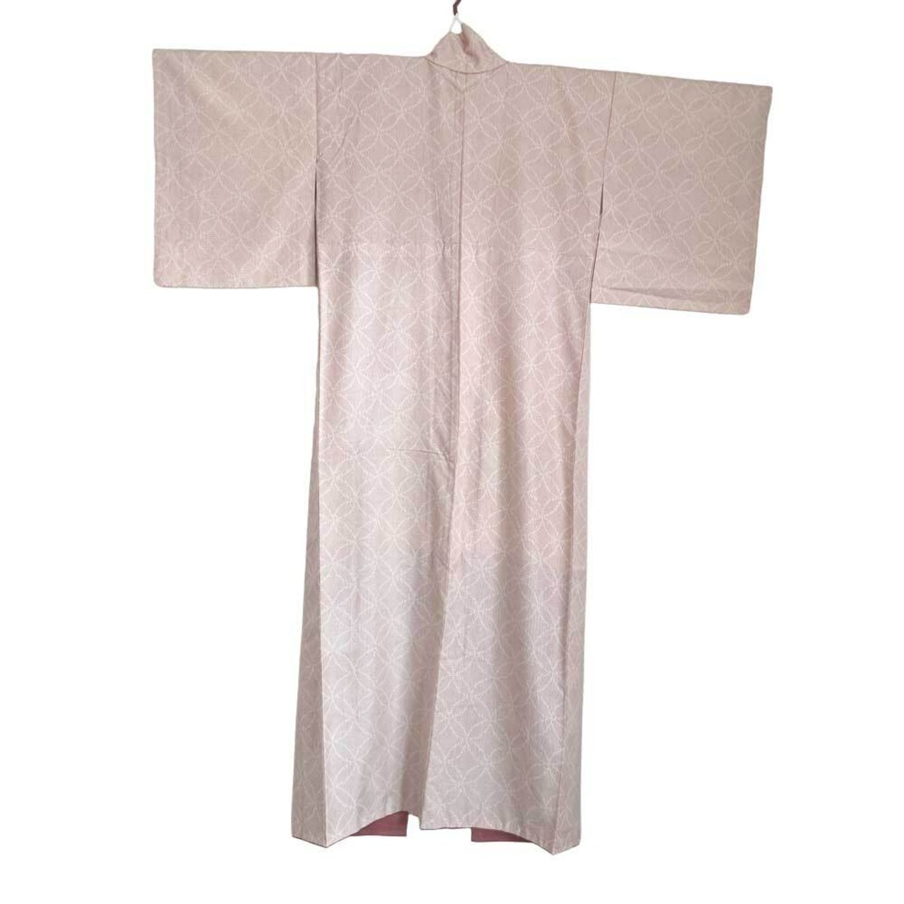 A handwoven silk tsumugi kimono with gentle red kasuri patterns running across an unbleached base. From a distance, it takes on a soft pink hue, radiating a quiet warmth within its rustic simplicity. The blurred edges of the kasuri, created by dyeing the threads before weaving, give the fabric its distinctive charm. Repeated shippō (seven treasures) patterns—interlocking circles symbolizing harmony and lasting happiness—add a sense of graceful continuity. The slightly textured silk, with its natural slubs, moves fluidly with the wearer, creating subtle shadows and an effortless elegance.