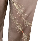 A homongi kimono featuring a deep brown base adorned with softly shifting hues of yellow-green to green in its tabane matsuba (bundled pine needles) motif. Delicate gold lines catch the light with subtle brilliance, while fine embroidery at each bundle adds a gentle sense of texture and depth. The smooth, lustrous silk enhances the calm palette with quiet elegance. In Japanese tradition, pine symbolizes constancy and longevity—qualities reflected in this kimono’s graceful balance of refined dignity and serene strength.