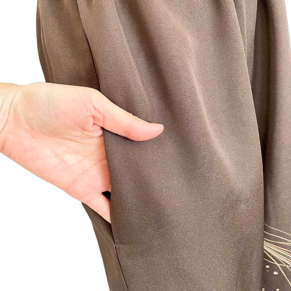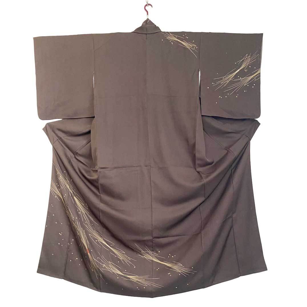 深みのある焦げ茶色をベースに、黄緑からグリーンへと穏やかに移ろう束ね松葉の模様が描かれた訪問着。金彩のラインが静かに光を受け、松葉の束ね部分には細やかな刺繍が施されています。絹ならではのなめらかな肌触りと上品な光沢が、落ち着いた色合いに華やぎを添えます。松は常緑の象徴として「不変の美」「長寿」を意味し、この着物全体からは、成熟した品格と穏やかな強さが感じられる一枚です。