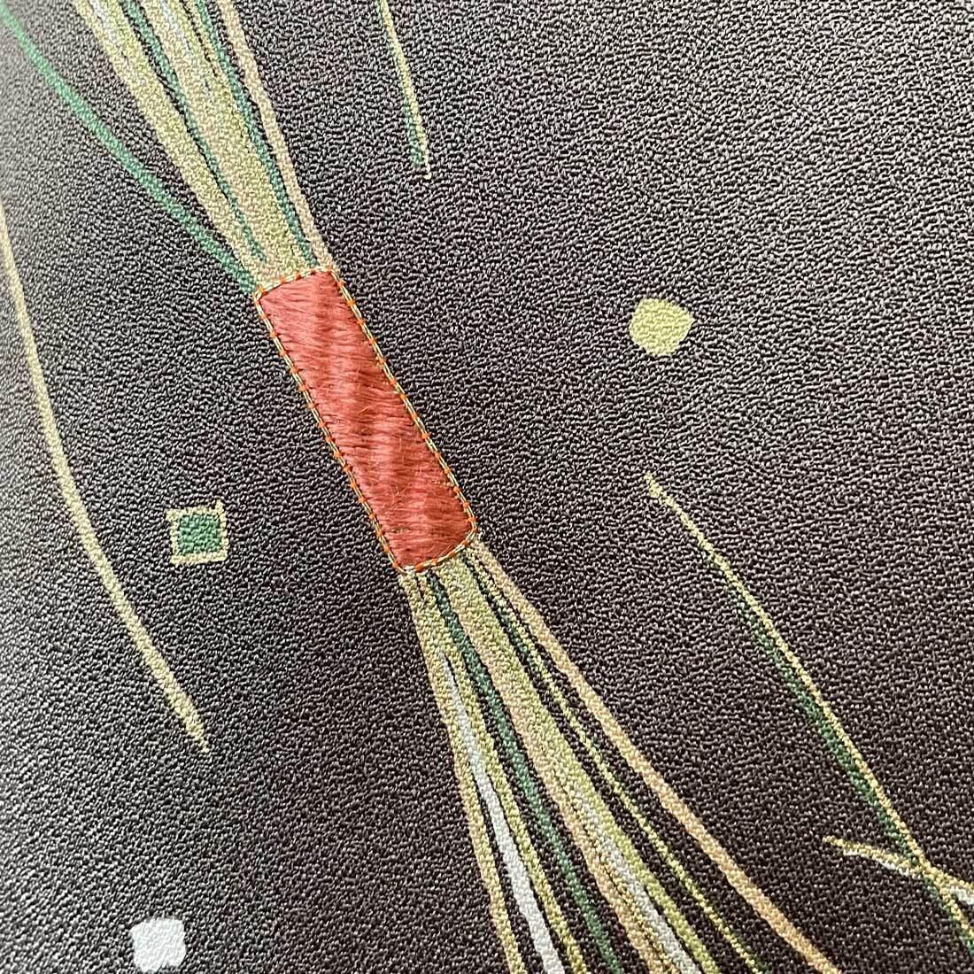 焦げ茶を基調に、金彩や刺繍が控えめに光る束ね松葉の模様。