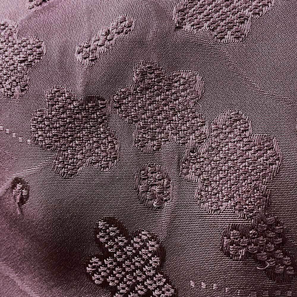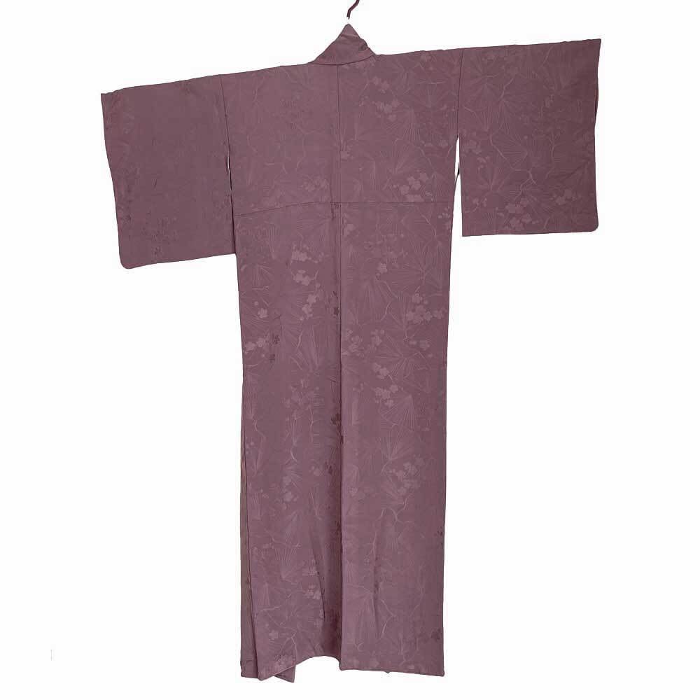 ローズピンクの絹がやわらかく光を受け、上品な艶を放つ色無地の着物。ふくれ織で表現された模様は、梅の枝花や松を思わせる線が浮かび上がり、無地でありながら奥行きのある立体感を生み出しています。触れた指先に感じるなめらかさと、見る角度で変化する陰影が、装う人の所作まで美しく見せてくれます。華やかすぎず、穏やかな華やぎを纏う、大人の女性にふさわしい一枚です。