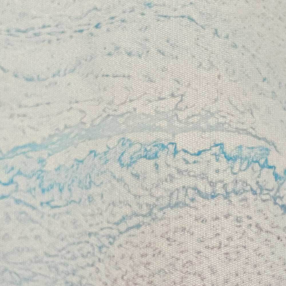 ごく淡い青みを帯びたアイスホワイトの地に、パステルのグレー・ブルー・ピンクが溶け合うように流れる小紋の着物。模様は、水面に風が触れた瞬間の揺らぎを思わせる墨流し。偶然が生む線の重なりが、静かな奥行きを感じさせます。遠くから見ると一色に見えるほど繊細で、近づくほどに色の層と動きが現れる──その控えめな美しさが、透明感のある上品さを引き立てる一枚です。