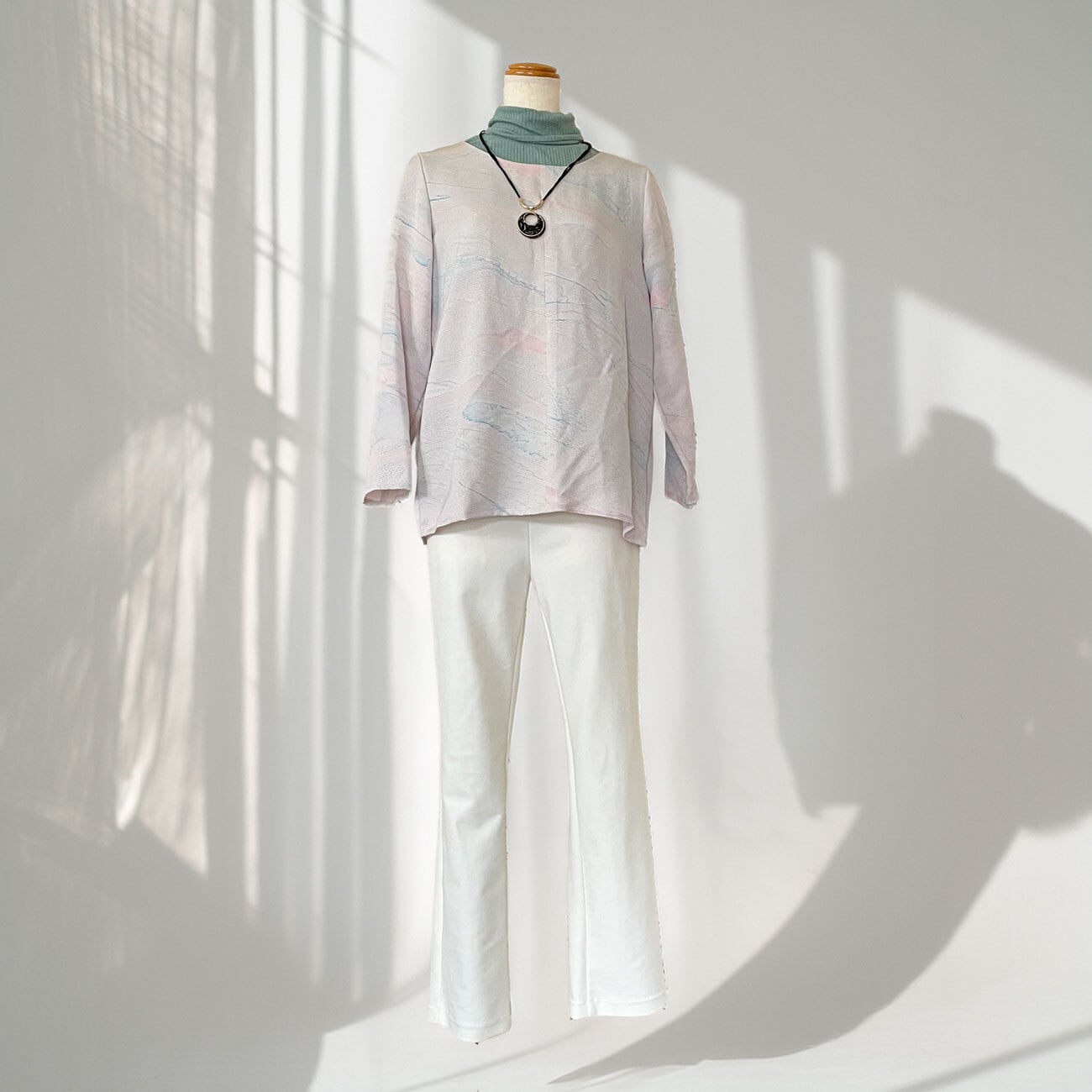 A komon kimono featuring an icy white base with a hint of blue, where pastel shades of gray, blue, and pink flow together in harmony. The suminagashi (marble-dye) pattern evokes the gentle ripples that appear when a breeze touches the surface of water. The organically layered lines, born from chance, create a quiet sense of depth. From a distance, it appears as a single tone, but up close, delicate layers of color and movement emerge—revealing a restrained beauty that enhances its luminous elegance.