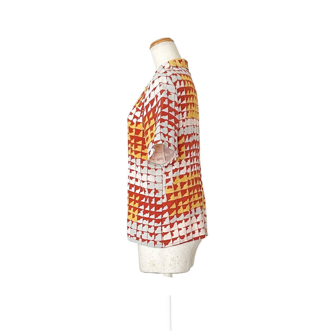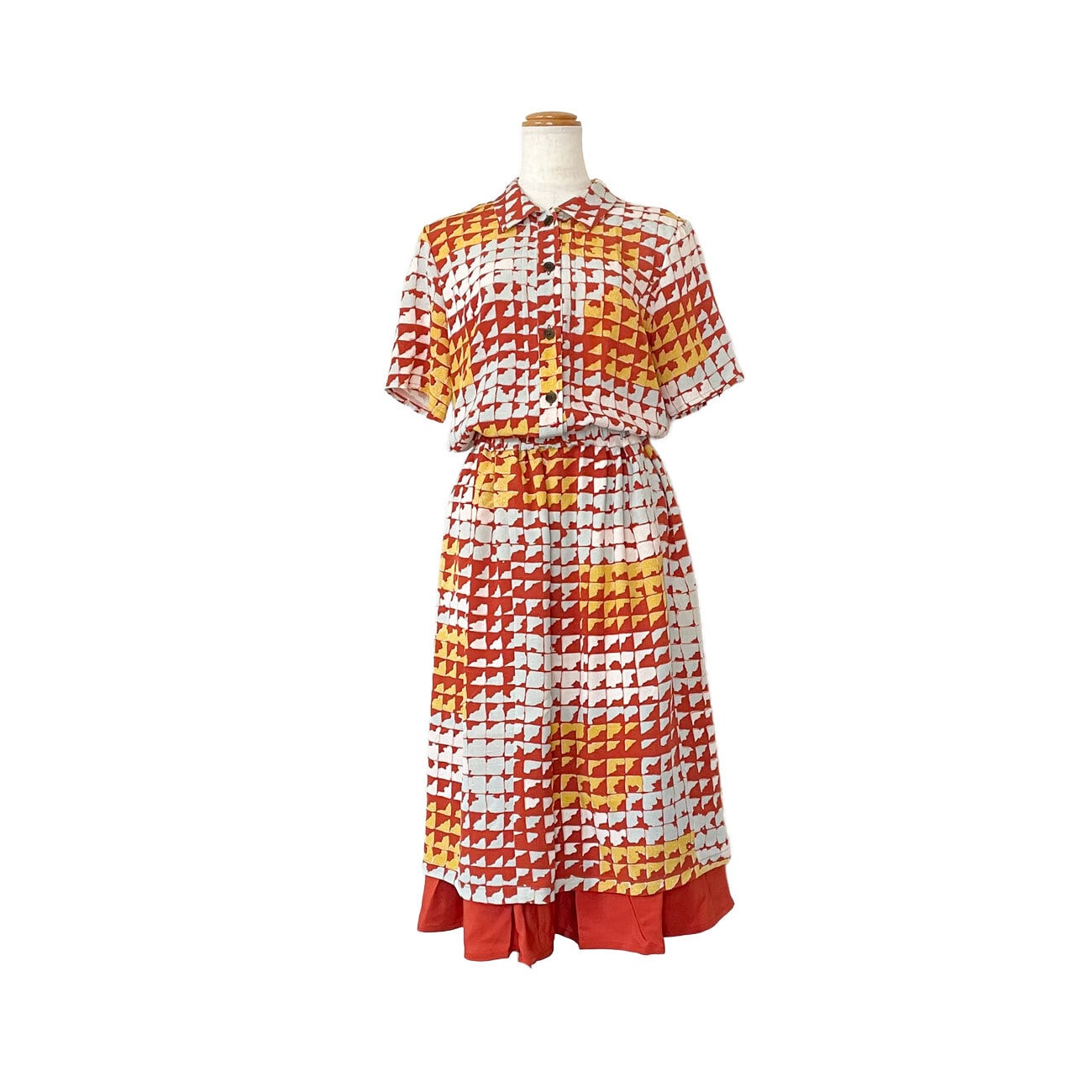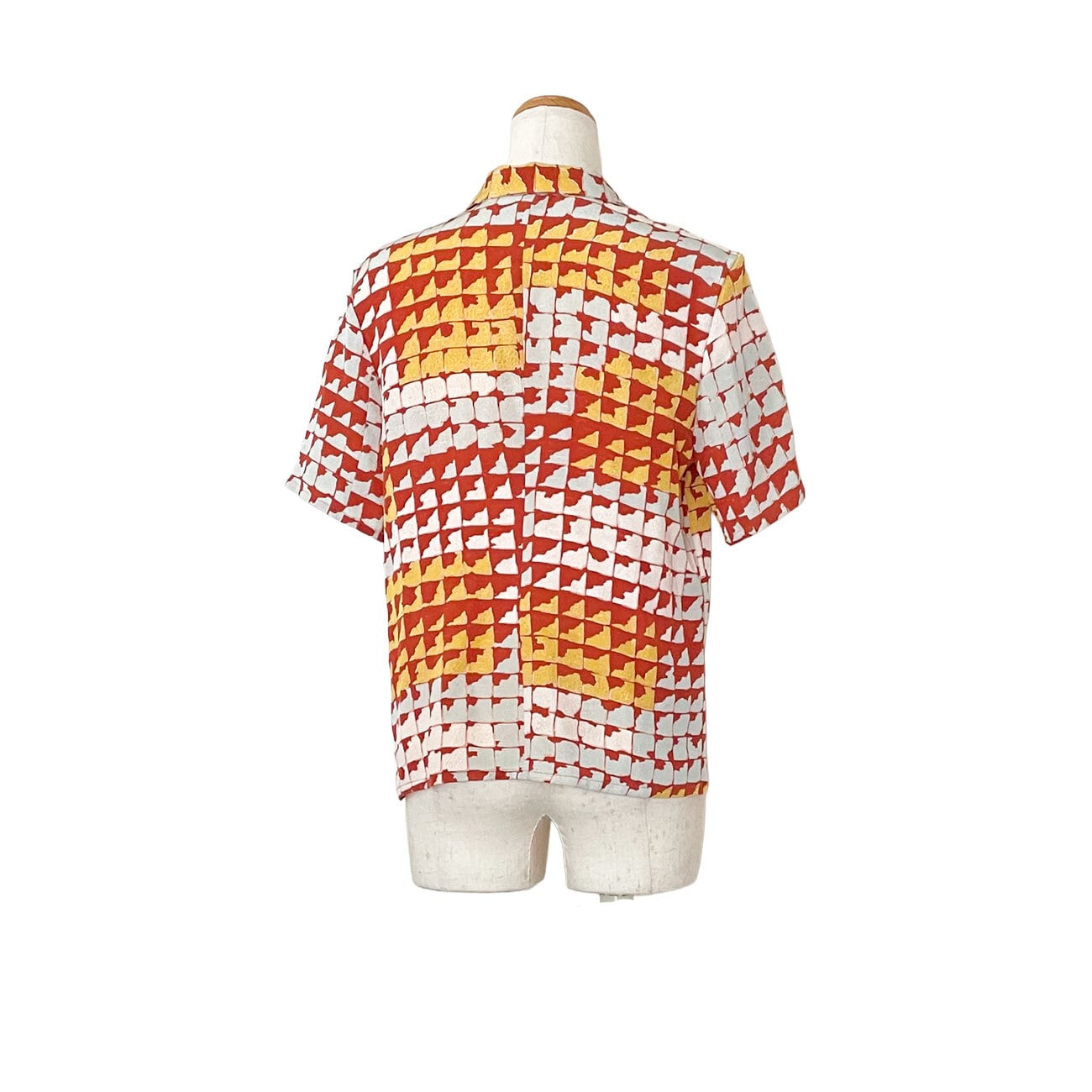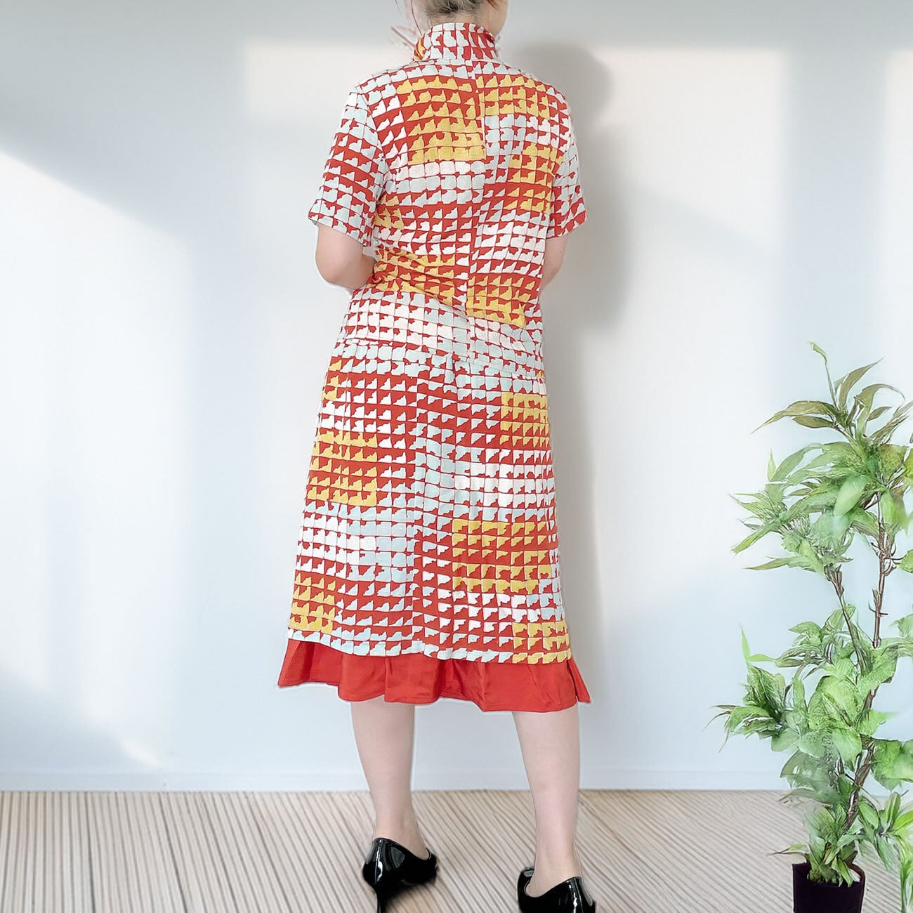 赤茶色の地に、水色とからし色が絶妙に組み合わされた小紋の着物。角が欠けたような独特の四角形が並ぶ幾何学模様は、まるでモザイクのように色の配置が少しずつ変化し、遠くから見ると柔らかなグラデーションを描きます。節のある縮緬生地は素朴な温もりを感じさせ、ふんわりとした質感が肌に心地よく寄り添います。レトロな色合いの中にモダンなリズムが息づく、軽やかで個性ある一枚です。