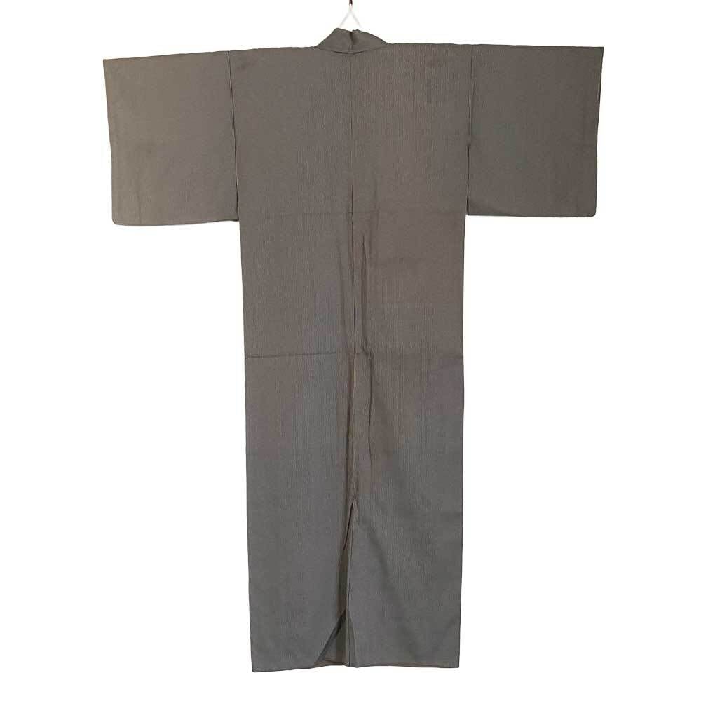 深緑と焦げ茶の糸で織り出された細やかな縦縞が、静かなリズムを刻む万筋模様の着物。よく見ると、竹の節を思わせる小さな段差が規則的に現れ、単調なストライプにはない自然なニュアンスを生んでいます。染めではなく織りによって表現された模様は、糸そのものの色が生み出す奥行きが魅力。お召ならではのしなやかさと滑らかさを備え、動くたびに光を含んで艶やかに揺れる、穏やかで上質な風合いの一枚です。