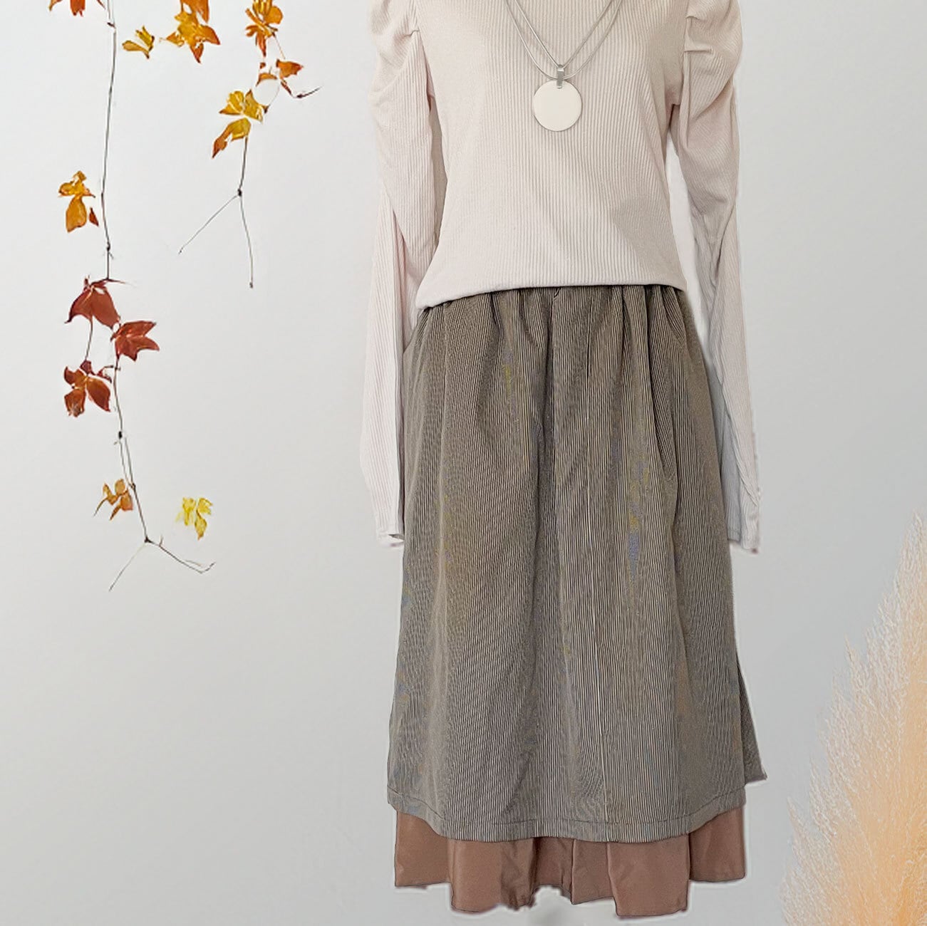 このスカートの魅力は、動くたびに生まれる二重のリズム。
