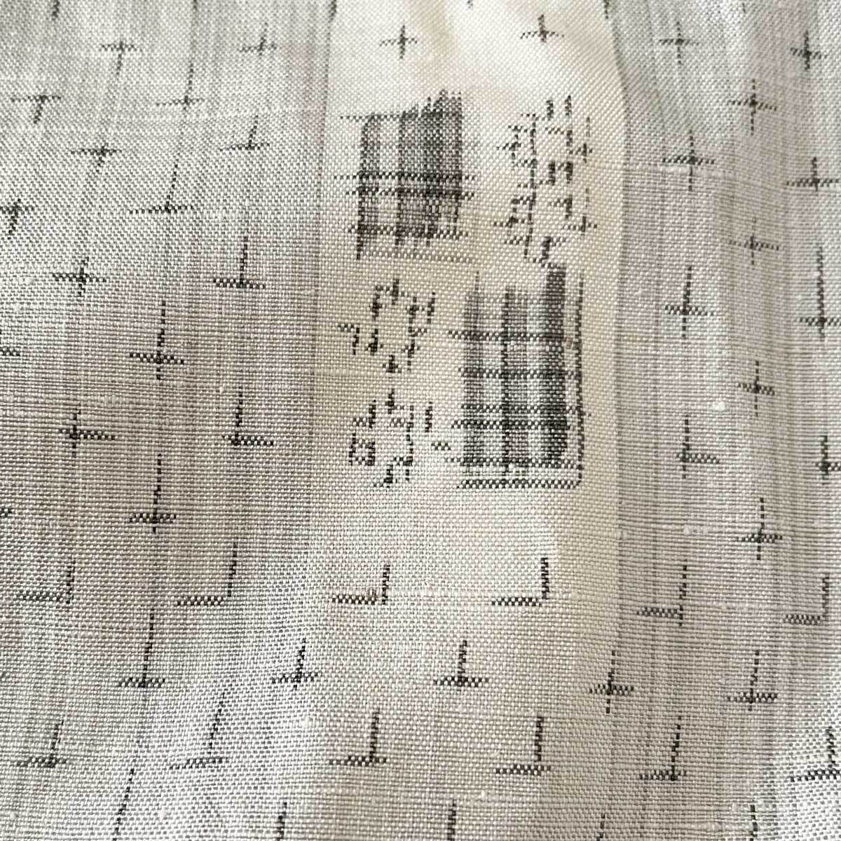 白からライトグレーにかけての穏やかなグラデーションが美しい、紬の着物。素朴な風合いの中に、しなやかさと程よい張りを兼ね備えた上質な生地です。全体には十字や丁字の形をした絣が整然と並び、ところどころに現れる白地の幾何学模様がリズムを添えています。織りの陰影が光を受けて静かに揺らぎ、ミニマルながらも奥行きを感じさせるデザイン。上品さと温かみを兼ね備えた一枚です。