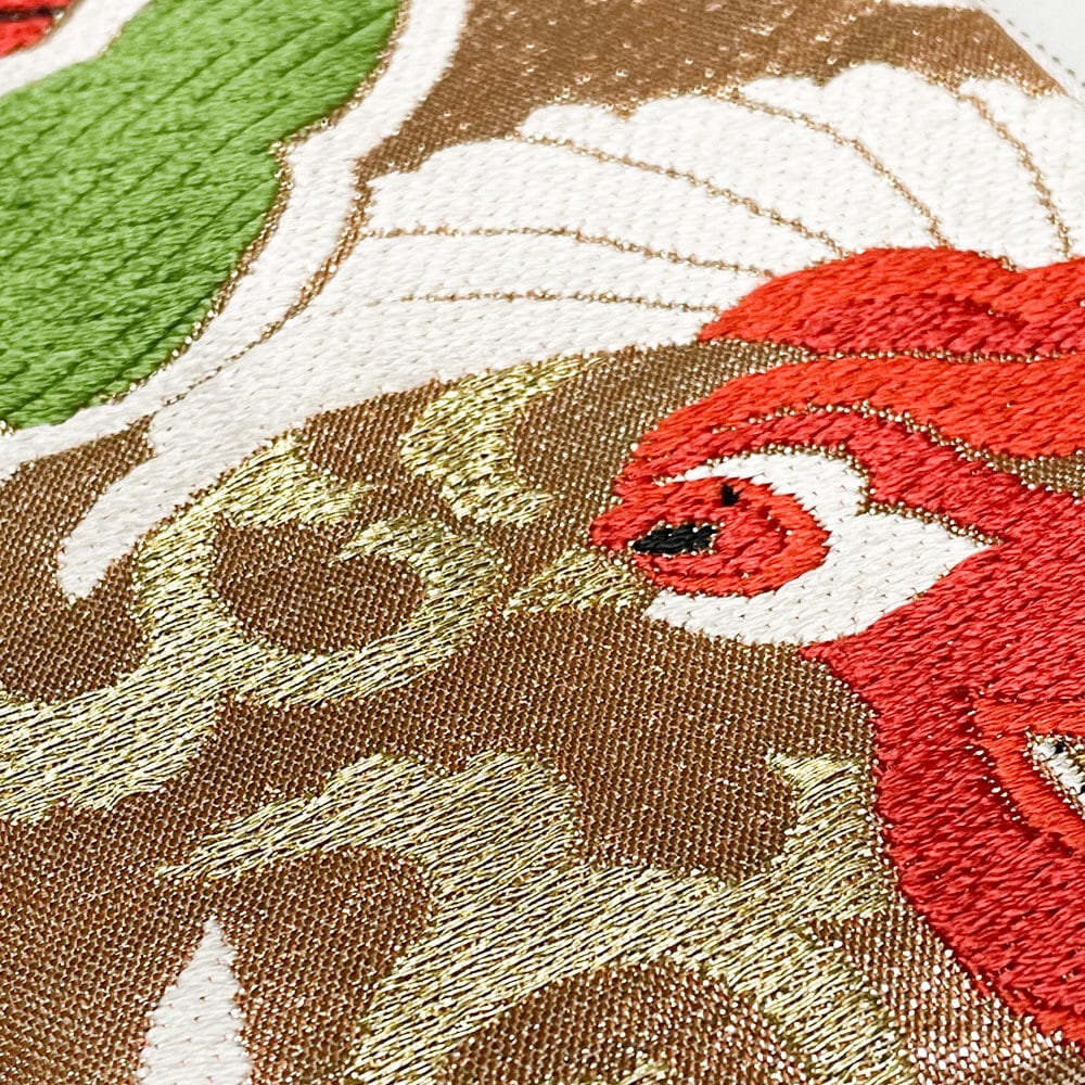 Made from a bright golden fukuro obi, this fabric features bold arrangements of phoenixes and classical motifs. It carries an air of grandeur and elegance, yet its dynamic design adds a modern sense of movement and energy.
