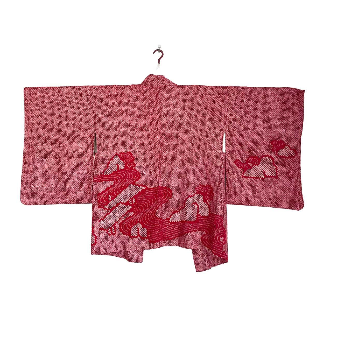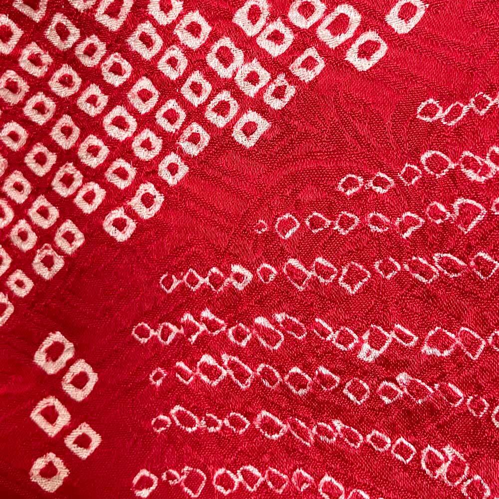 レトロモダンな総絞りの羽織。深みのある、日本らしい赤色。明るく鮮やかな色味の反面、岩と流水に笹が添えられた自然やわびさびを感じる静かなモチーフです。コントラストのあるユニークさをお楽しみいただけます。