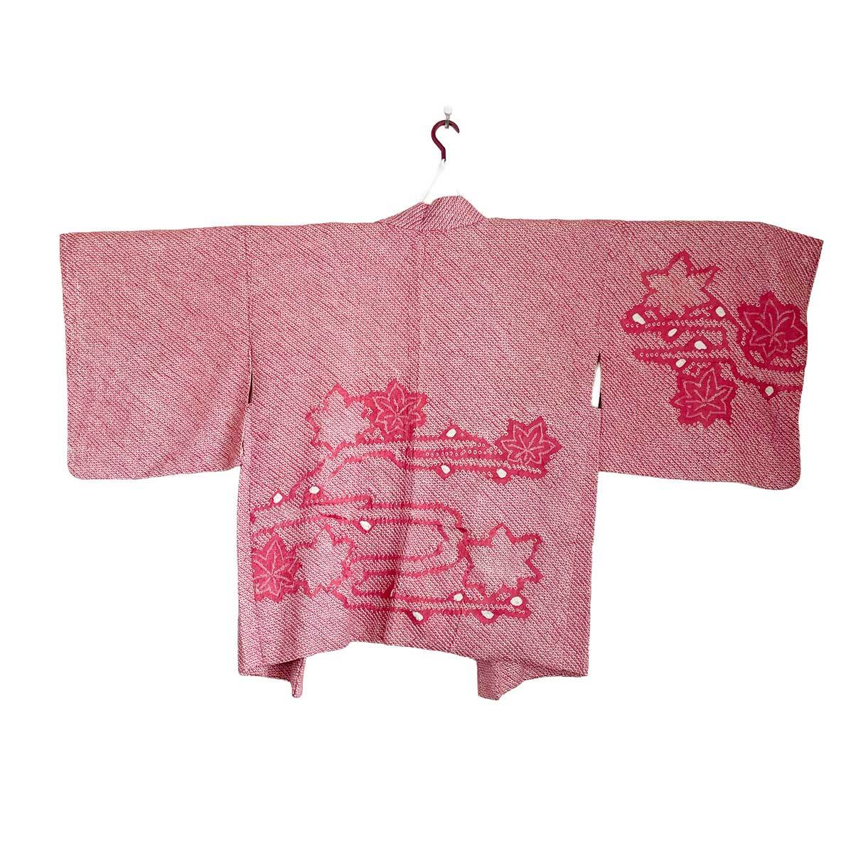 レトロモダンな総絞りの羽織。優しいピンク色で女性らしさが引き立ちます。敷き詰められた鹿の子の中には、紅葉が流水に流れる様子の模様。竜田川模様と呼ばれる秋の風景を描いています。平安時代より千年以上も受け継がれてきたモチーフで、日本ならではの美しきストーリーを感じてください。