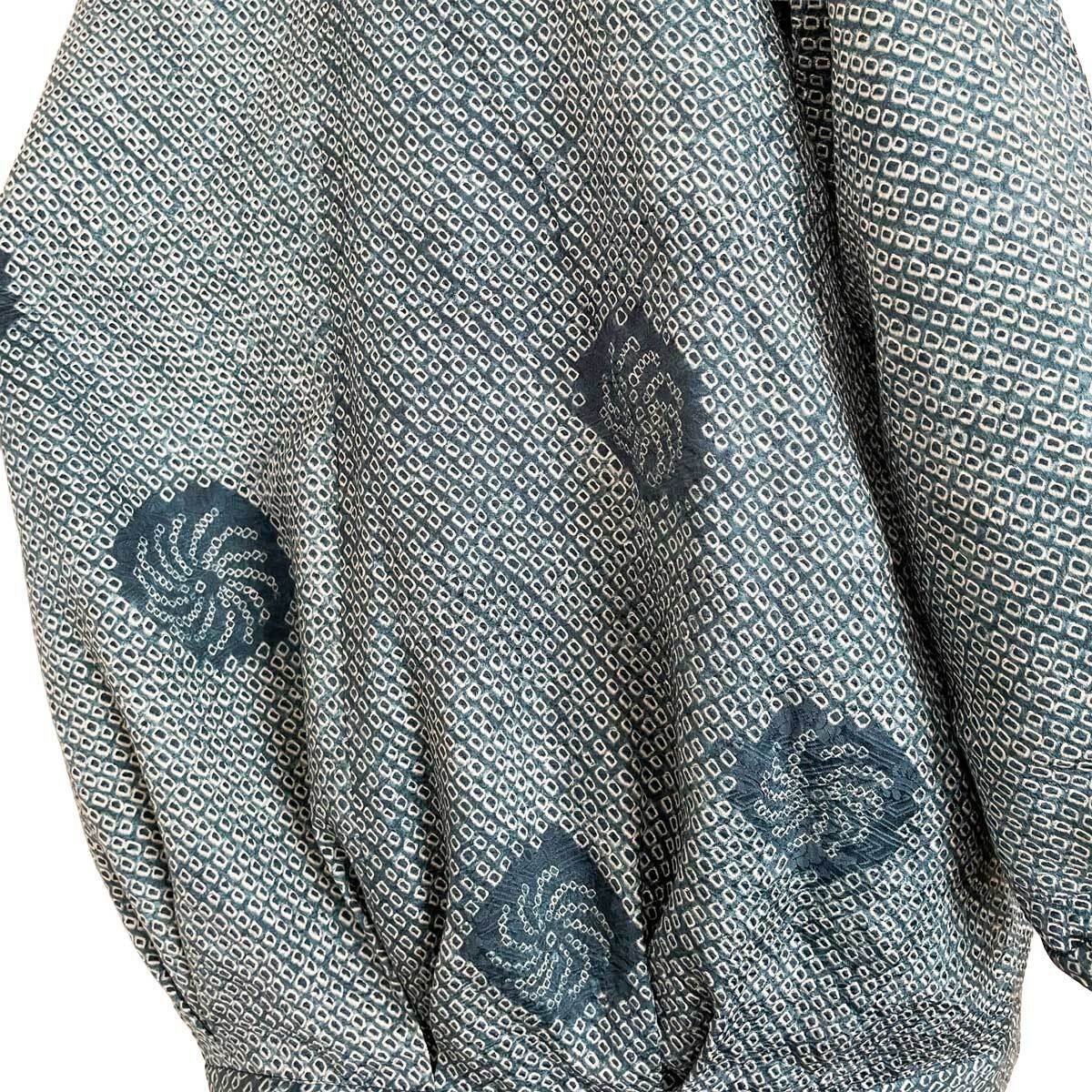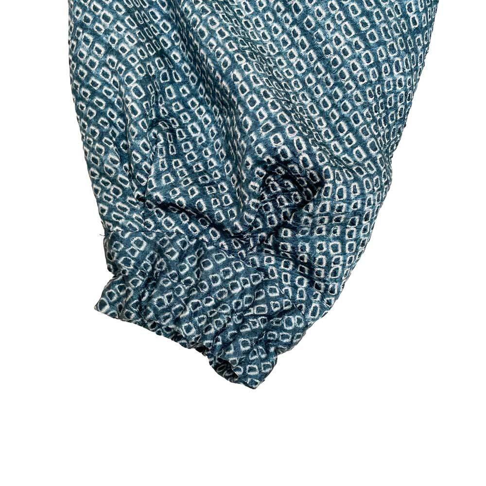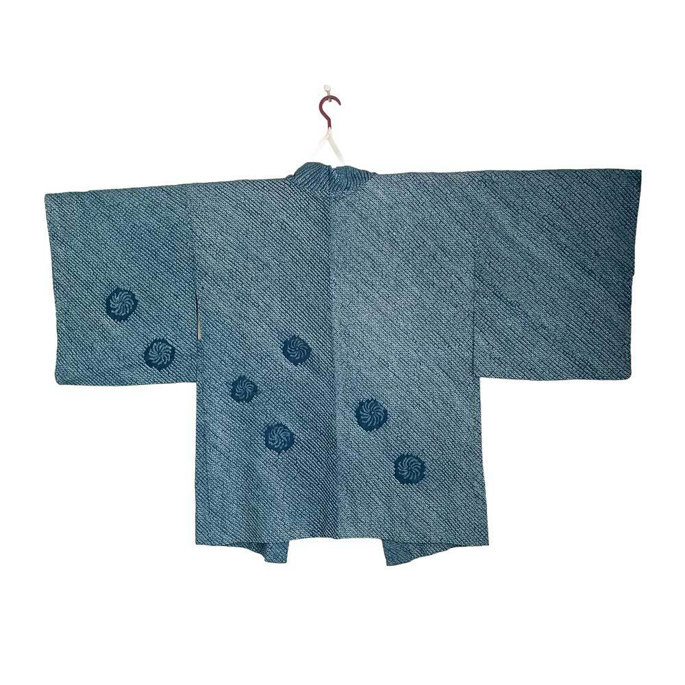 レトロモダンな総絞りの羽織。見かけるのは珍しい、落ち着いた青色。模様としてはこちらも珍しい、まるい形のシンプルな抽象模様。控えめな菊にも見えますが、色味との兼ねあった雰囲気で渦巻きのようにも。絞りの粒も小さく染めもしっかり入り、地紋も浮き上がる艶やかな質感の生地です。