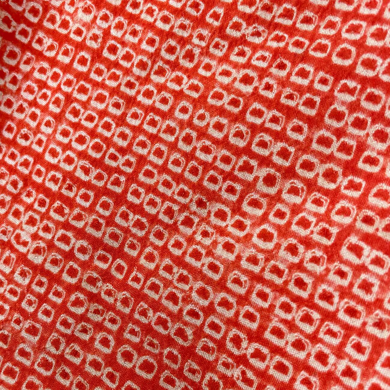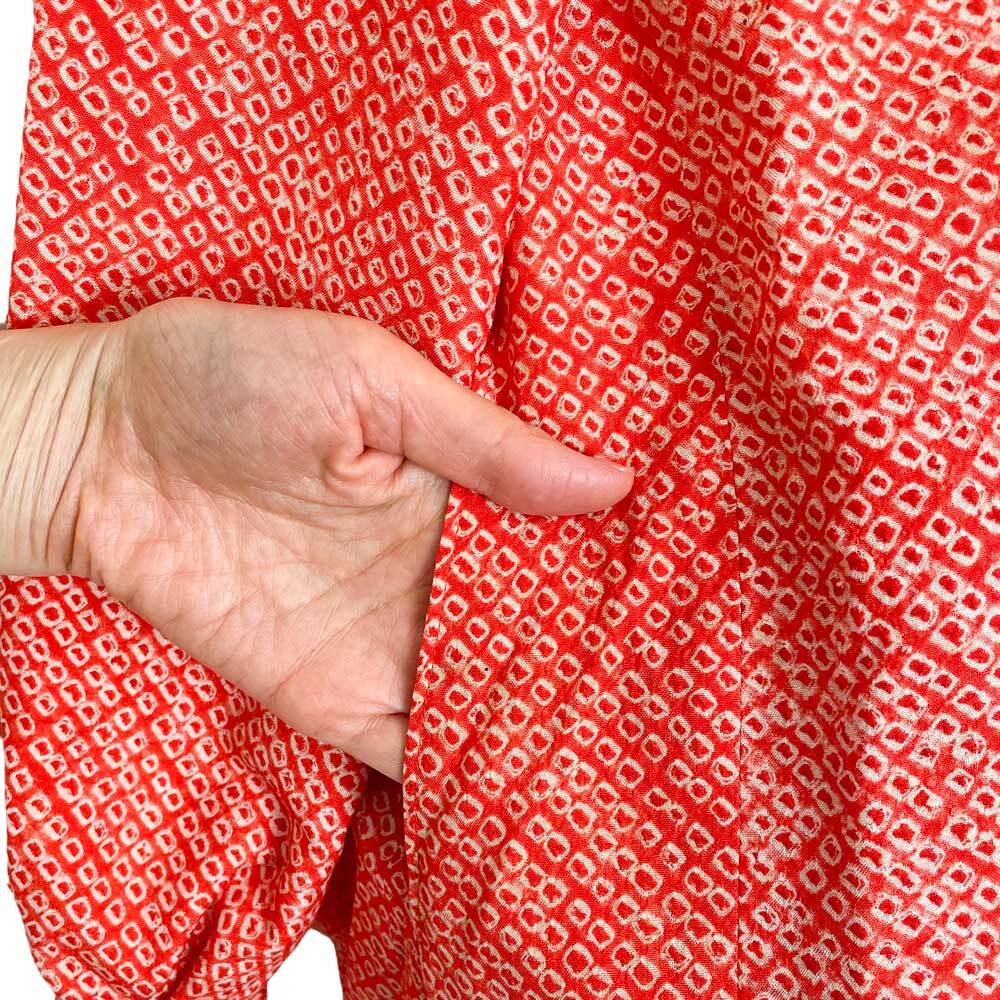 レトロモダンな総絞りの羽織。橙みを帯びた鮮やかな赤、日本古来より受け継がれた伝統色の朱色が、華やかながらもどこか懐かしく落ち着く色合いです。粒の一つ一つに、丁寧に絞り糸を巻いた手仕事の後を見て取ることができます。美しき着物文化の詰まった生地を、ぜひ日常でお楽しみください。