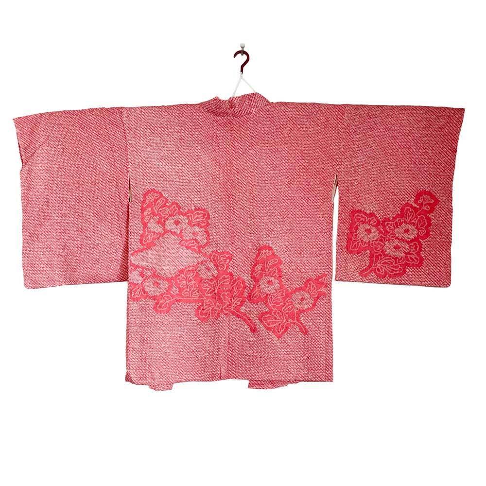 レトロモダンな総絞りの羽織。淡く明るいピンク色に染められた、柔らかい色味です。その中に大ぶりな菊花と枝葉模様がたっぷりと施されており、全体的に優しくフェミニンな印象を演出するのにぴったり。模様の中の絞りのない部分からは美しい地紋が浮き上がり、光の加減でたっぷりの艶を放ちます。