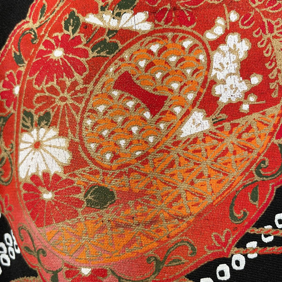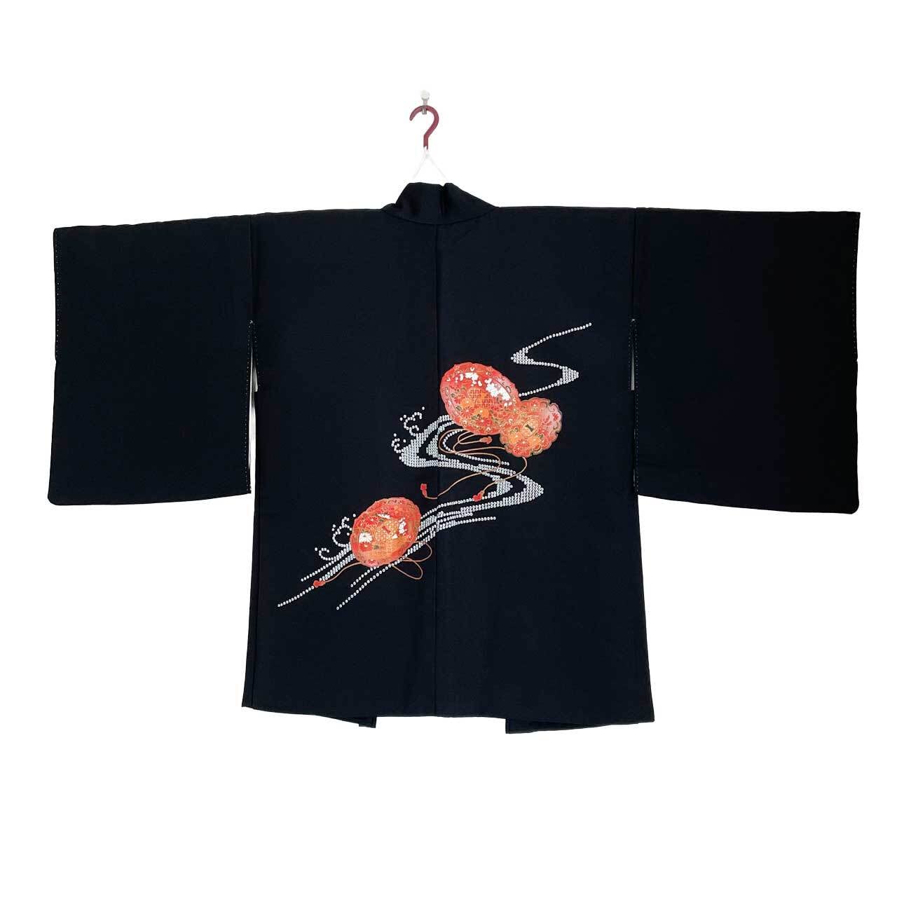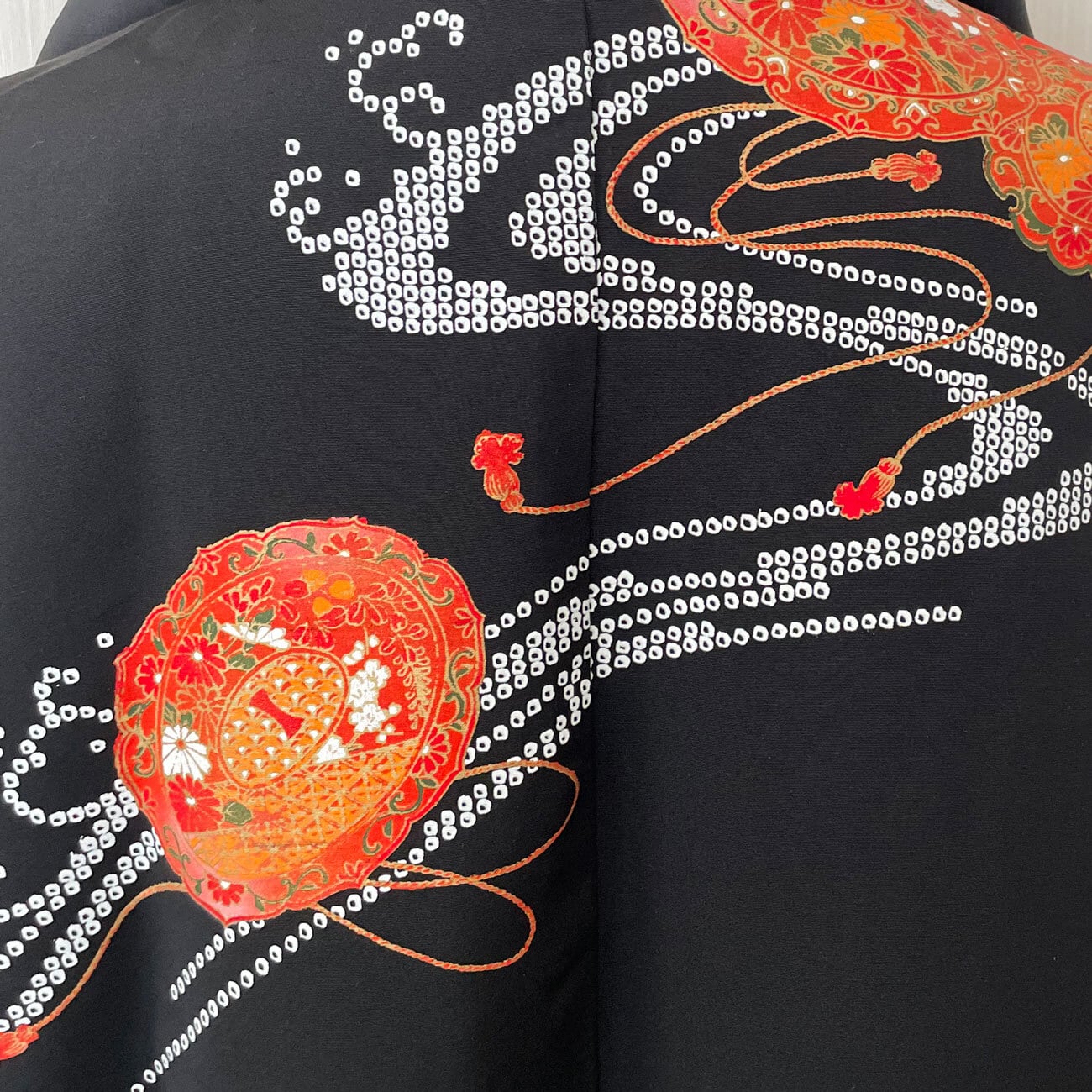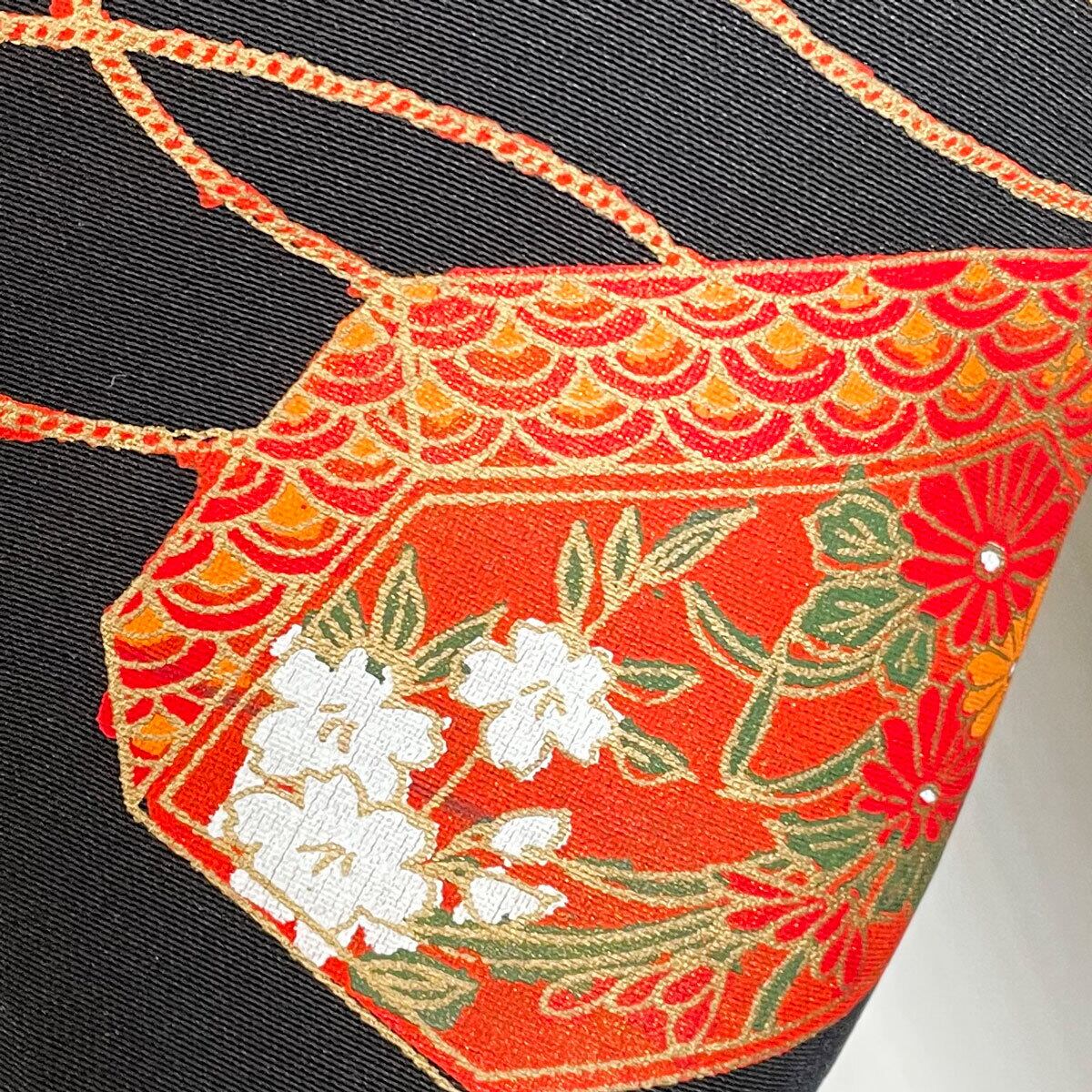 黒を背景に、朱色系の鏡裏模様の絵羽織から。繊細な筆致と、コントラストのある鮮やかな配色。朱色の上に金色の縁取り。絞りを模した白い鹿の子模様で、流れを感じます。