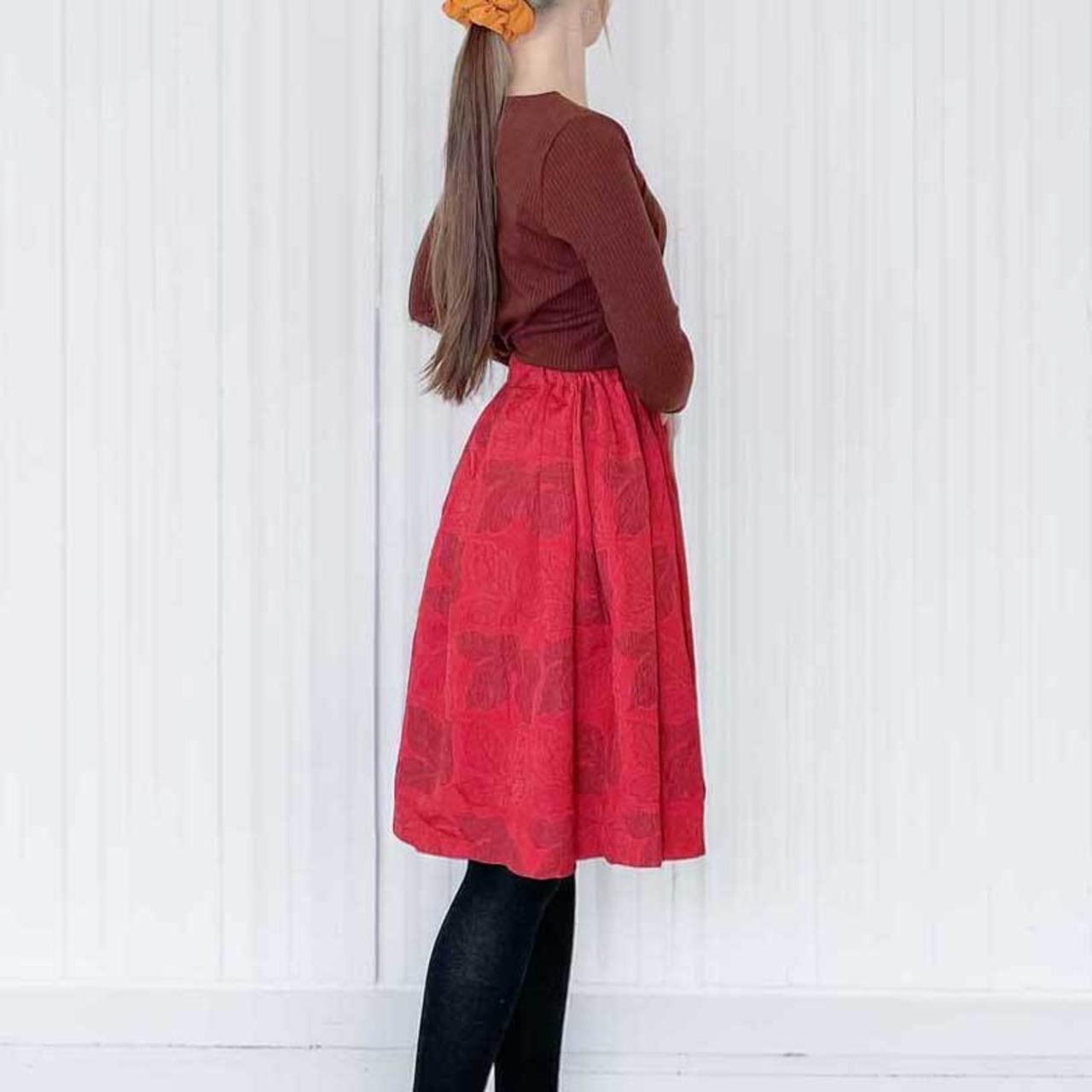 ところどころ厚みのある今回のふくれ織生地で気になるのがギャザーぶくれ。このスカートのウエスト付近はタックを入れているので、ボリュームが抑えられ、もたつきが気になりません。