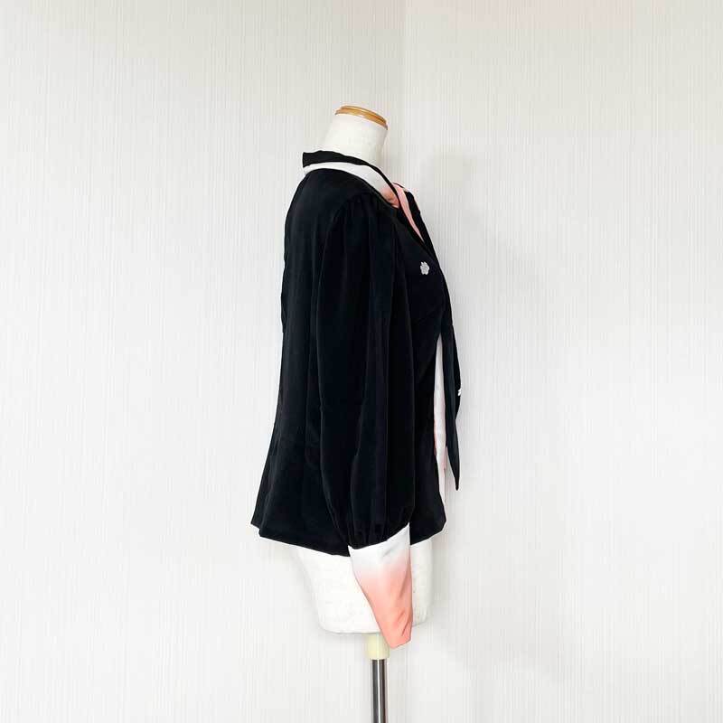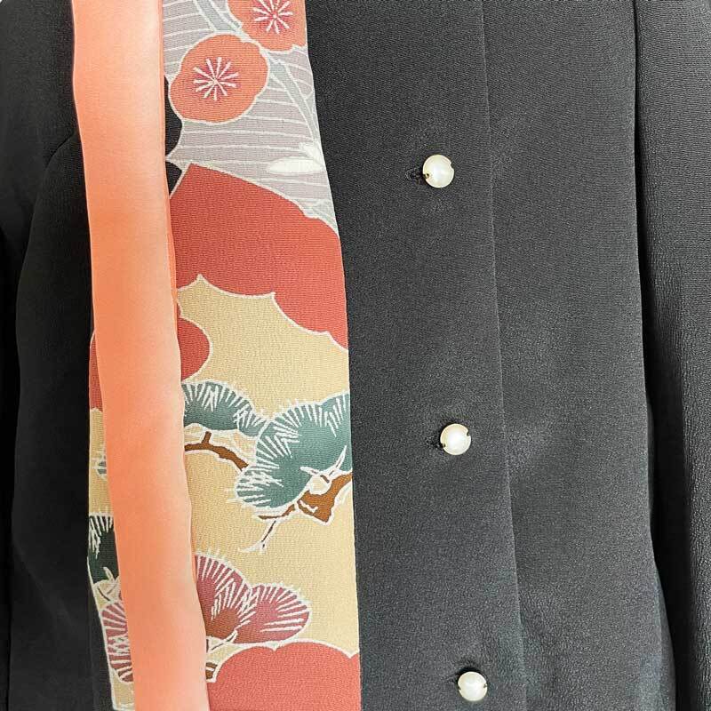 サブリボンとカフスはタイの模様と好配色の淡いサーモンピンクのグラデーション。暈しの八掛も着物特有の美しいシルク生地です、ふんわりと優しい雰囲気のポイントパーツを演出しています。女性らしいパール調ボタンもあしらって。